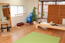 熊野杉を使用した床に差し込む陽の光が溶け合う空間がまるで森林浴のような空気感、包み込まれるような安心感が心地良いスタジオです。